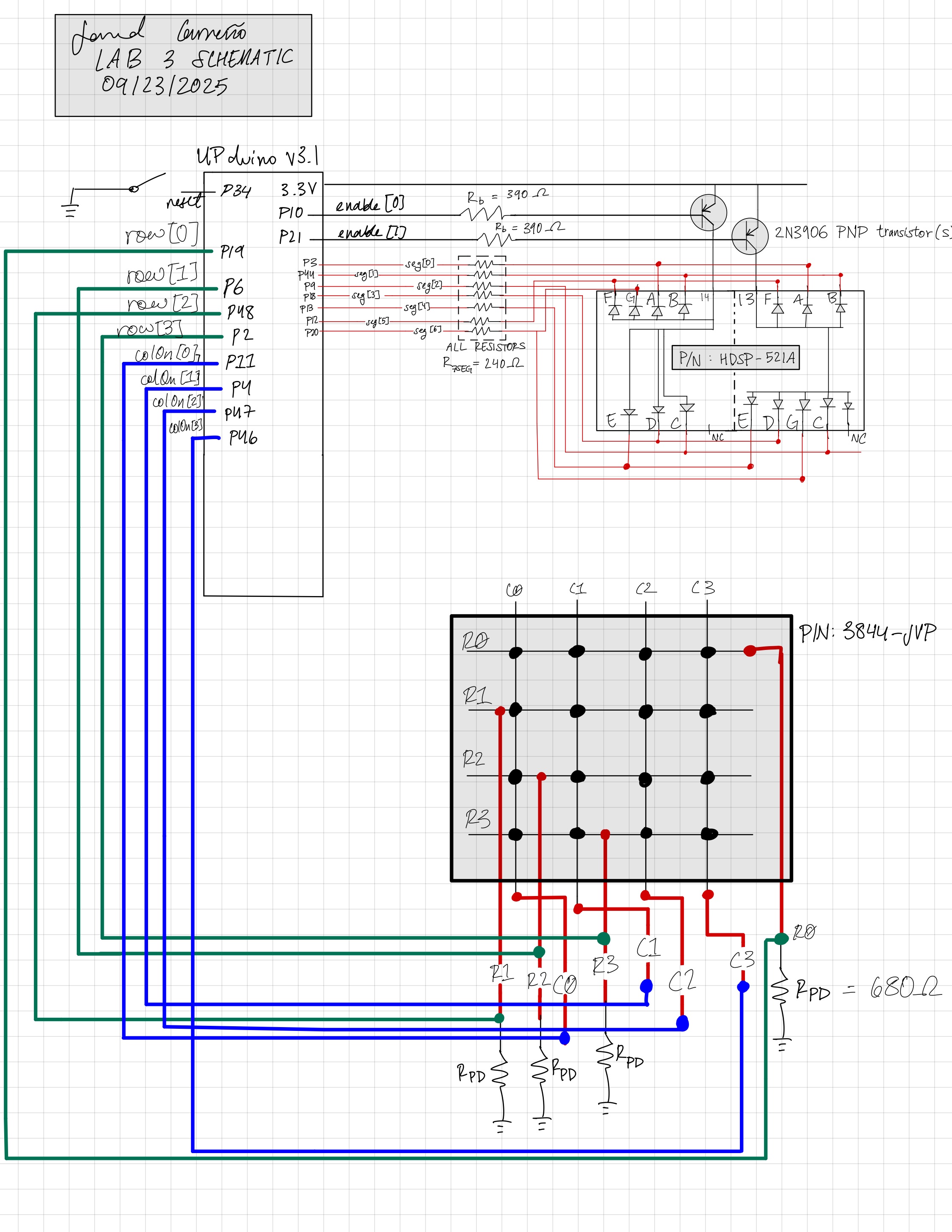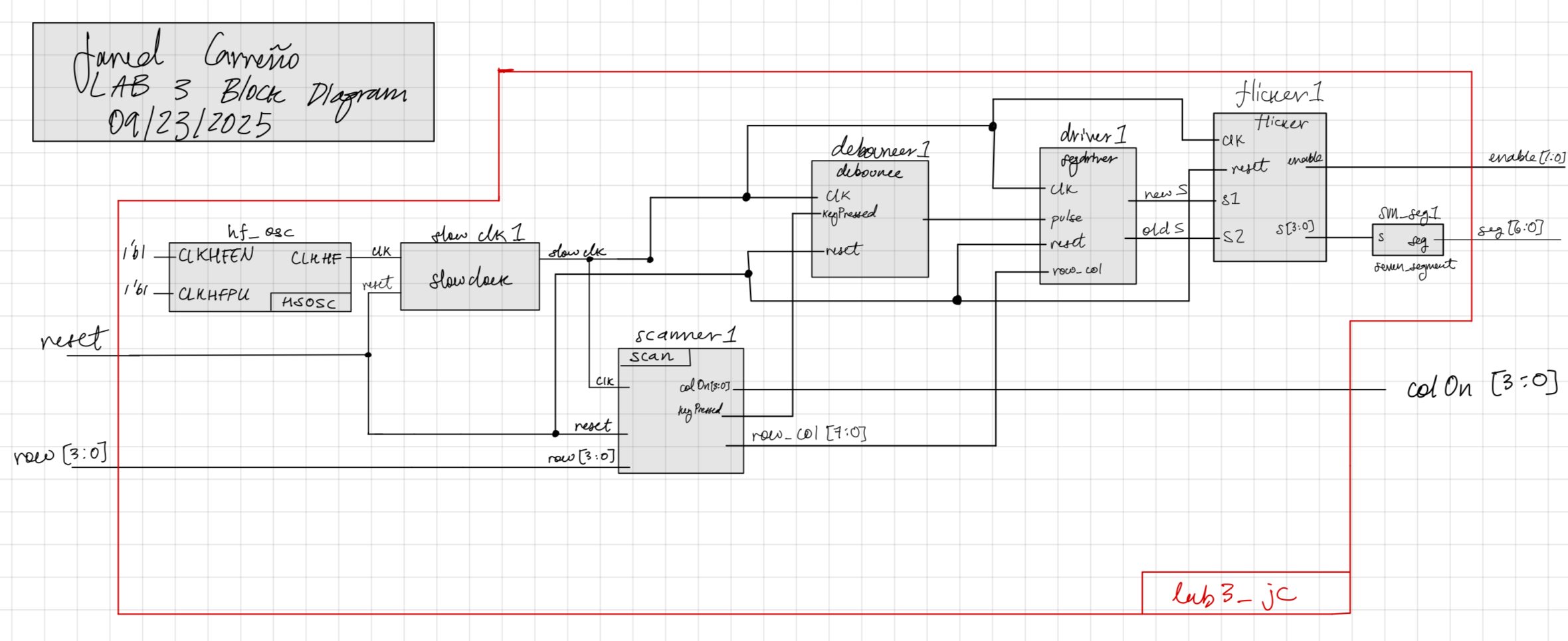 In Lab 3, we were tasked with utilizing a keypad that is very prone to mechanical debouncing in order to display numbers on a dual seven segment display that shifted from left to right as new inputs were introduced. This builds on concepts that were utilized in Labs 1 and 2.