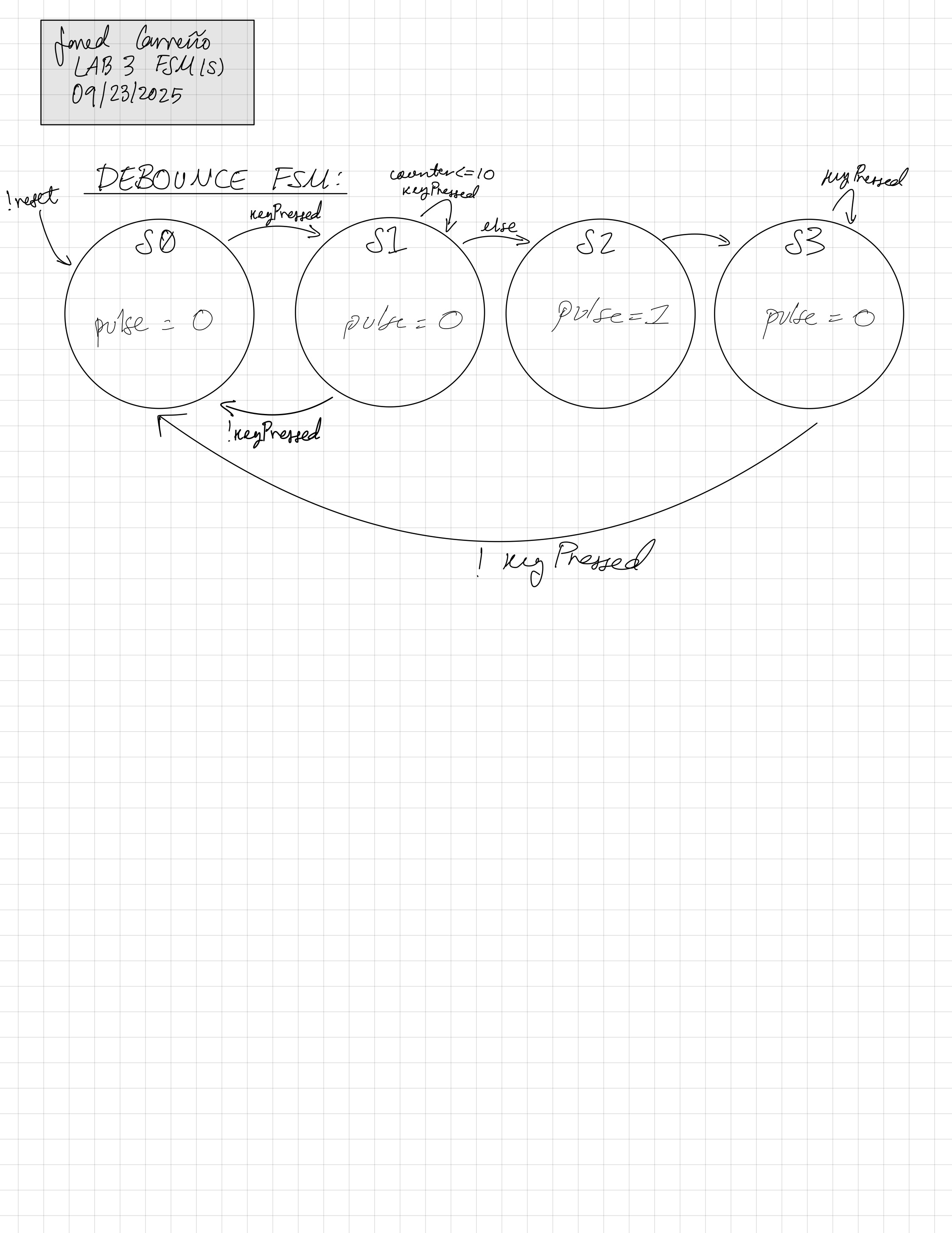 As shown in Figure 3, the debounce FSM waits for keyPressed to be high, when it detects that it is high, it goes into S1 that enables a counter. Once the counter reaches 50ms and keyPressed is still high, then it moves onto S2 that sets pulse HIGH, indicating that there is a valid key press than can be displayed. If the key is still pressed after it is registered, keyPressed is still HIGH, so the FSM stays in S3 until the key is released, which restarts the FSM waiting for a valid press.