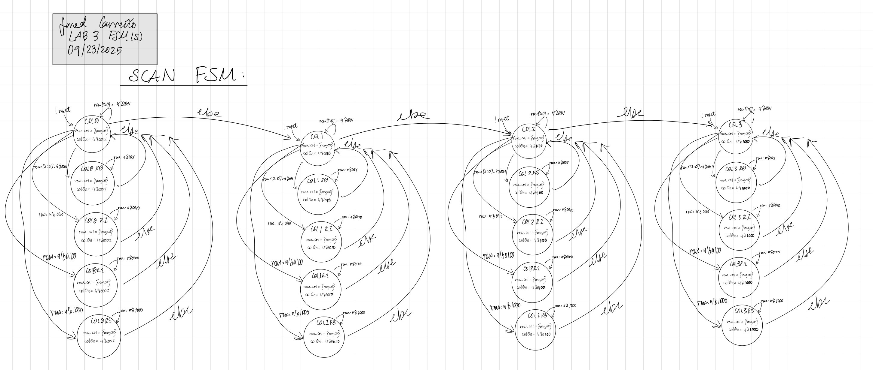 As shown in Figure 2, the scan FSM drives the columns and has a corresponding state for each row and column combination. Using row[3:0], it will jump to the state that corresponds to the column and row, and will set the corresponding column high using colOn[3:0], which cycles through one-hot encodings that enable each column, as the each state outputs row_col = {row, colOn}. The way this is designed ensures that there will be no states where multiple rows are pressed, attempting to limit the possibility of the wrong digits being shown