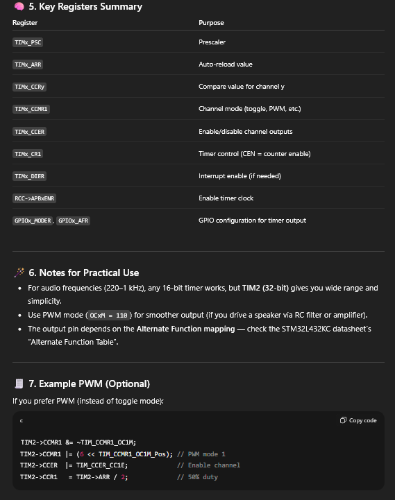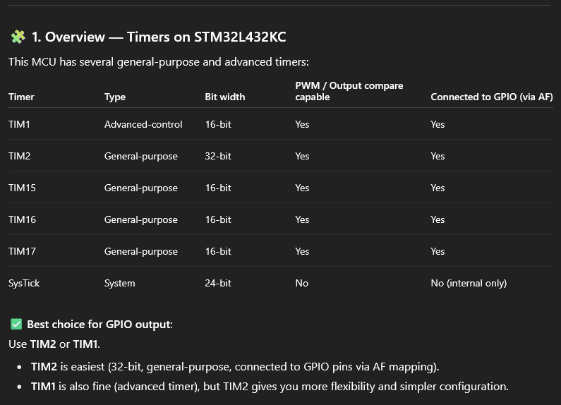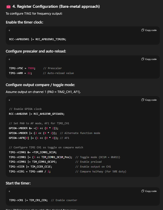The AI was able to produce a pretty sensible response. I would attribute this to the fact that the information of our STM32 MCU is readily available, along with plenty of examples that the LLM can draw on. I will say that the AI did not mention the EGR register, which is crucial for this implementation to function properly. The LLM’s response is shown below:
