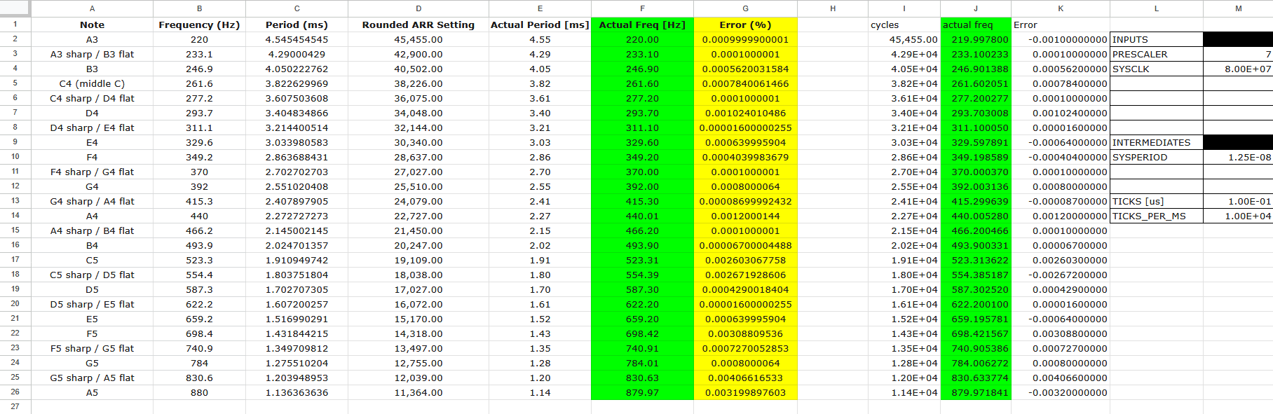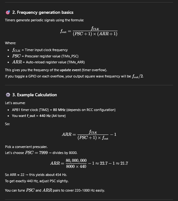 The design utilizes two timers, TIM15 and TIM16. These two timers have both a GPIO mode and PWM mode, which is what we want, but they also have the same registers, which will simplify the creation of our structs. The two timers start initially at the frequency of the system clock, fsys = 80 MHz, but are divided differently. The PWM timer has a PSC of 7, which allows for a precise measurement of the timing, while the duration timer has a PSC of 7999, which allows for higher frequency resolution. This can be seen by reducing the PSC for both and seeing the wrong frequencies being produced and/or the note duration being too short if the clock is too fast.