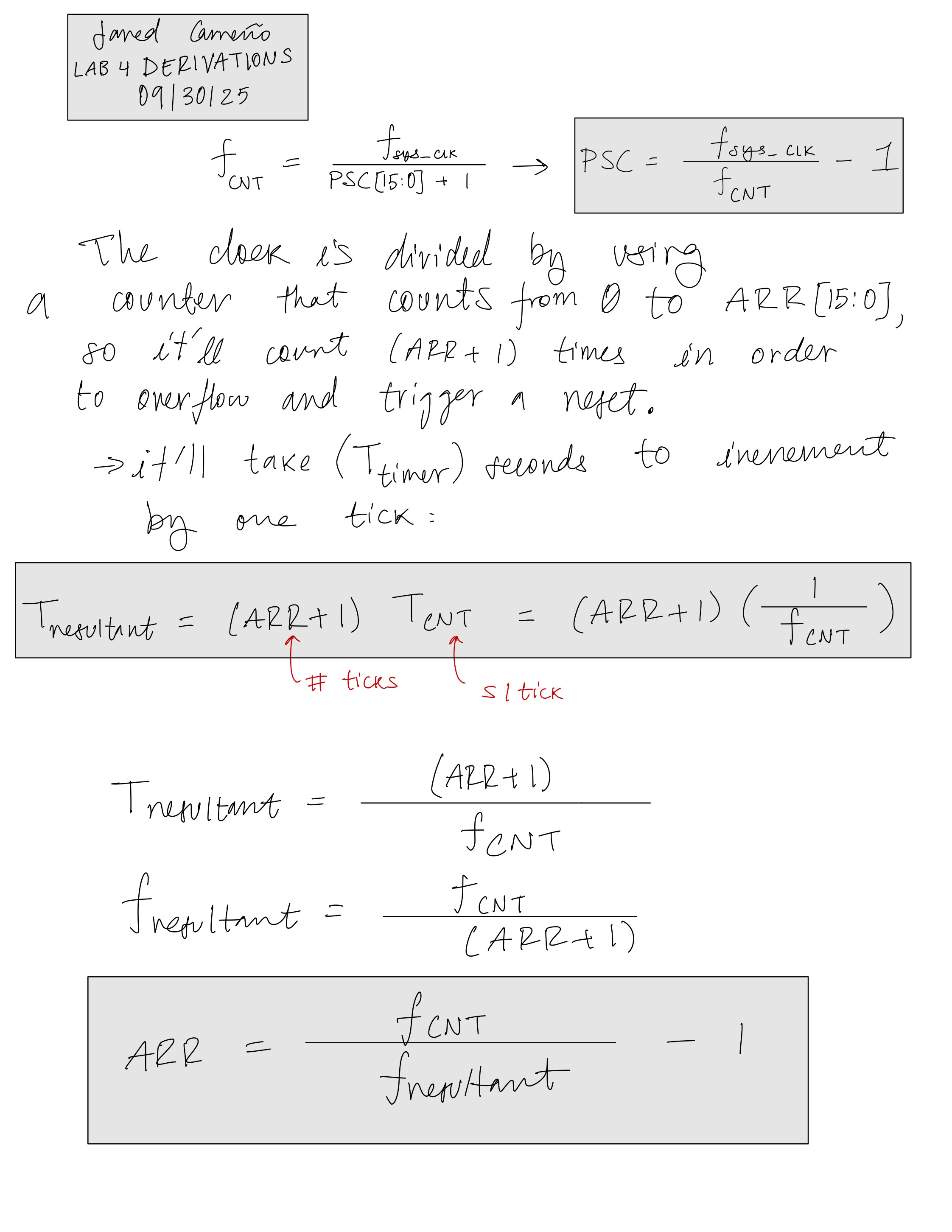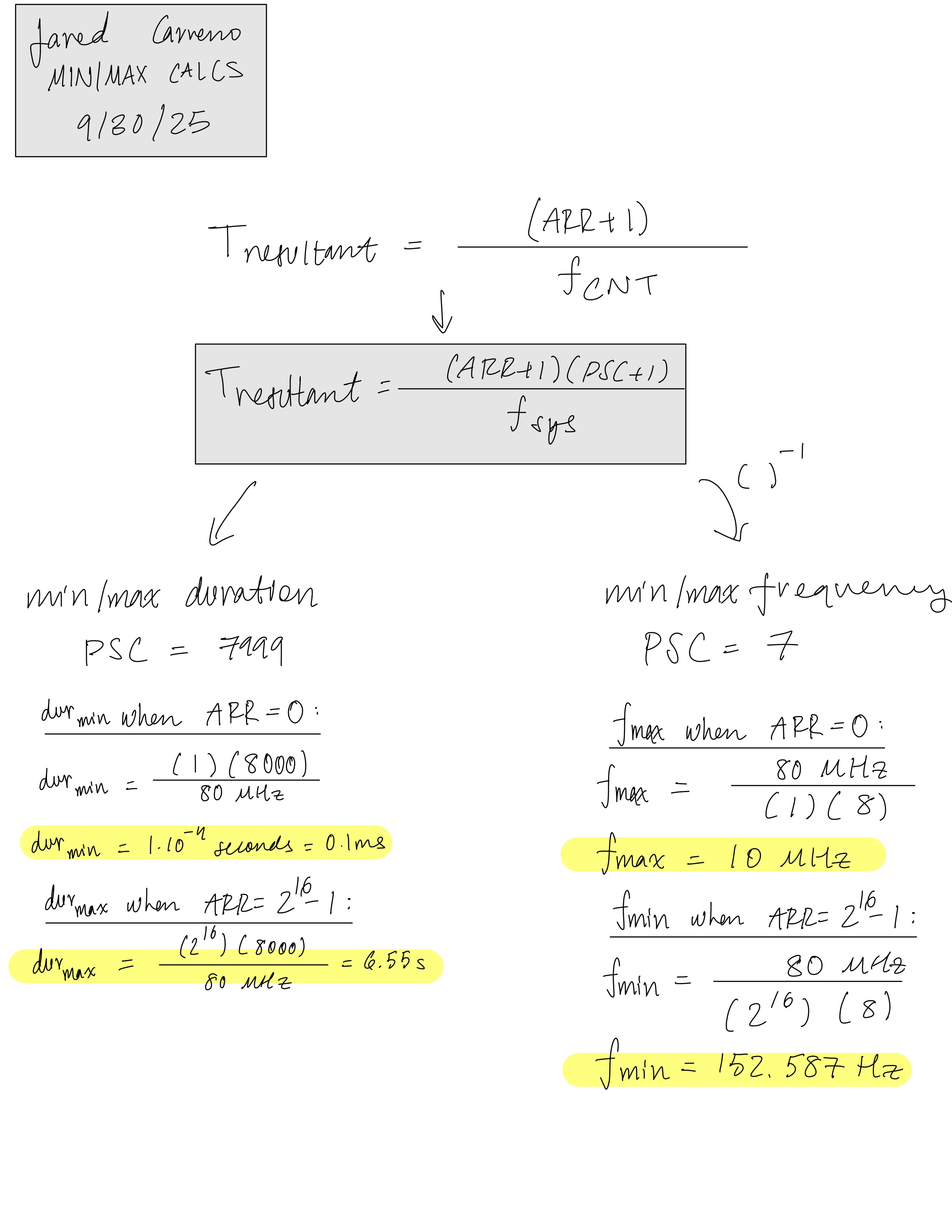 Figures 1 and 2 showcase derivation for equations that were used to determine ARR, as well as the period and the frequency of the note the system is outputting, Tnote and fnote. In Figure 3, we have the maximum/minimum frequency and duration calculations that provide justification as to why we decided to choose these prescaler PSC values. The reason why the PSC value is so important is mentioned in the Design and Testing Methodology section.