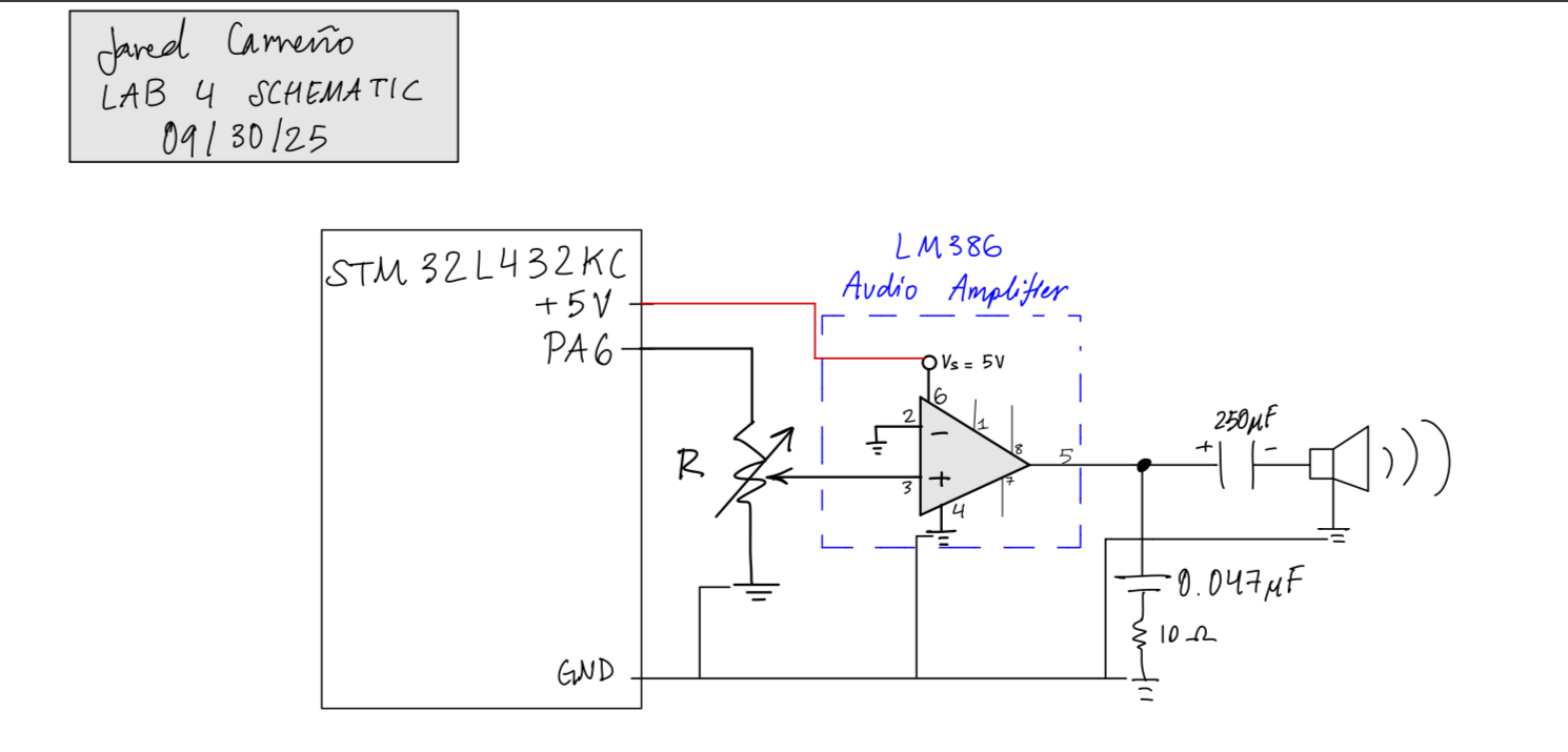 For Lab 4, we were tasked with programming our MCU to play music by producing a square wave that was then sent to a GPIO pin. This was done using timers that dictated the state of the GPIO pin, which creates a square wave with the correct frequency and duration.