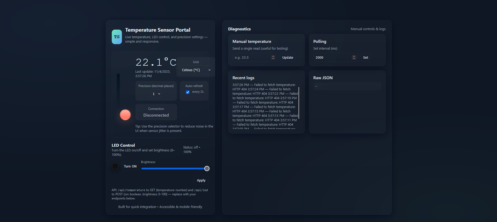 <meta name="description" content="Web portal to show temperature, control LED, and choose precision" />