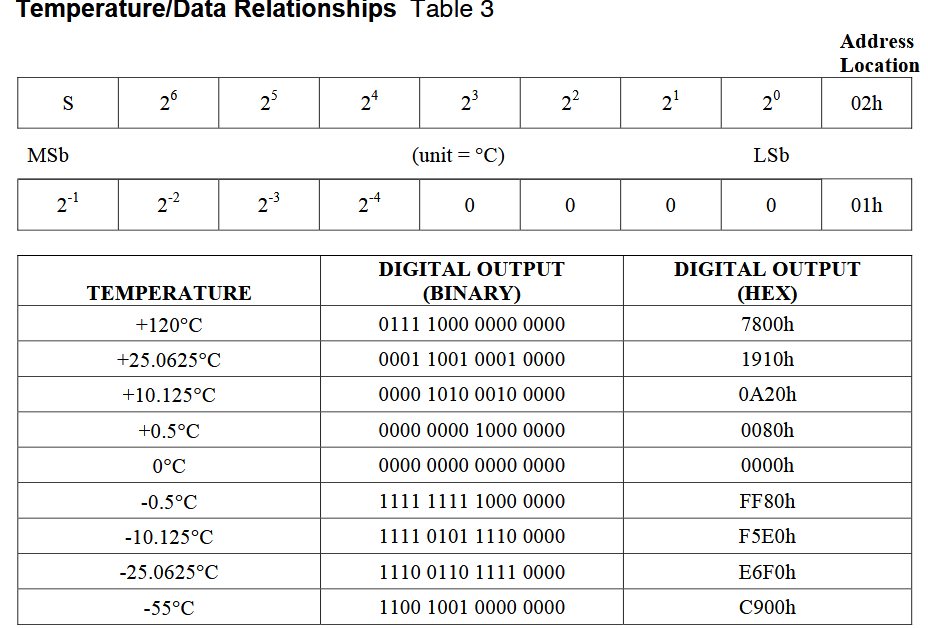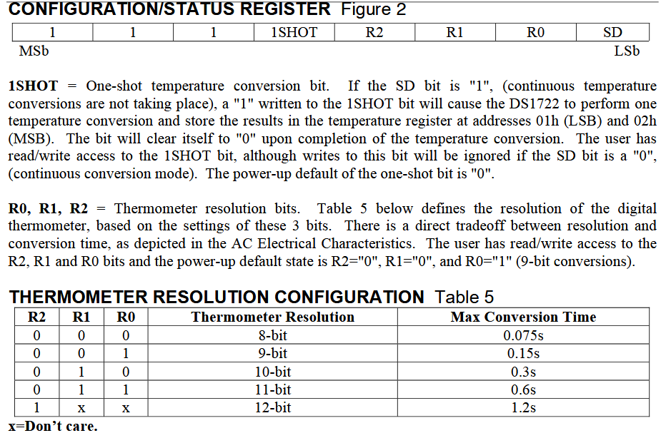 The readTemp() and setResolution() functions were utilized to set data resolution via the configuration register and read the MSB (most significant byte) and LSB (least significant byte) from their respective addresses (described in Figure 1). According to the user’s request, the configuration register (0x80) would be written to using the setResolution() function. In order to do so, the spiSendReceive() function was used to send the correct 8-bit value that aligns with the desired resolution, as shown in Figure 2. As for reading, the readTemp() called on spiSendReceive to first send the correct addresses we want to read from (0x01 and 0x02, as depicted in Figure 1), then send dummy bytes containing 0x00 to allow the DS1722 to respond with the temperature data. The data from 0x01 (LSB) and the data from 0x02 (MSB) were both read, concatenated into a single 16-bit number, then divided by 256 to give us the data’s corresponding temperature value according to the relationships shown in Figure 3.