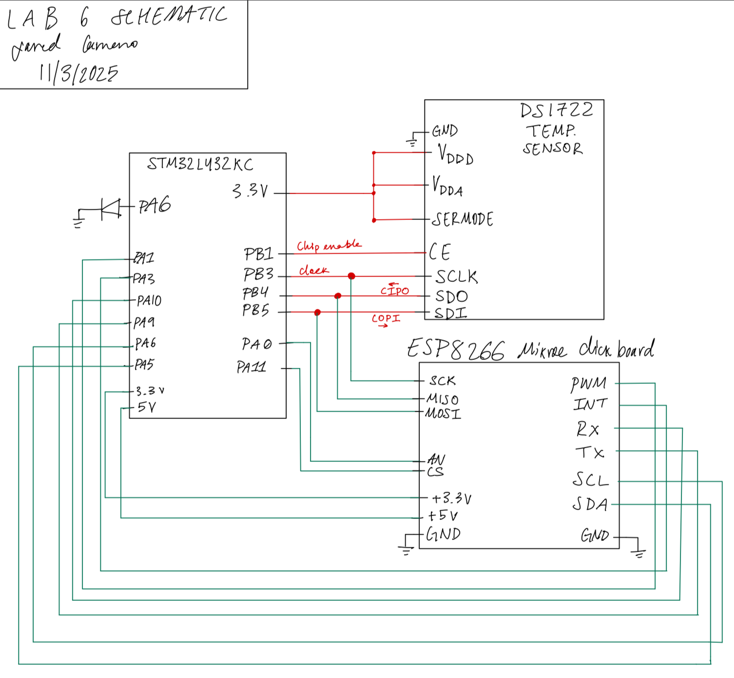 The overall approach here was utilizing the SPI and UART pins on our main MCU, the STM32, in order to communicate with the DS1722 and ESP8266, respectively. UART would send the HTML needed to create the website to the ESP8266 and send user requests and read data from the DS1722 over SPI.